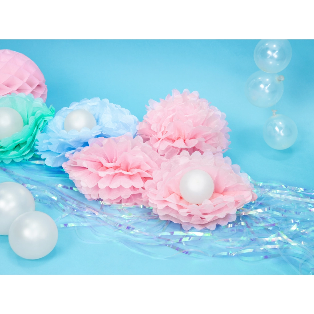 - Pompomok: Leheletkönnyű, selyem- vagy krepppapírból készült gömbök. Több méret kombinálásával erőteljesebb hatás érhető el.